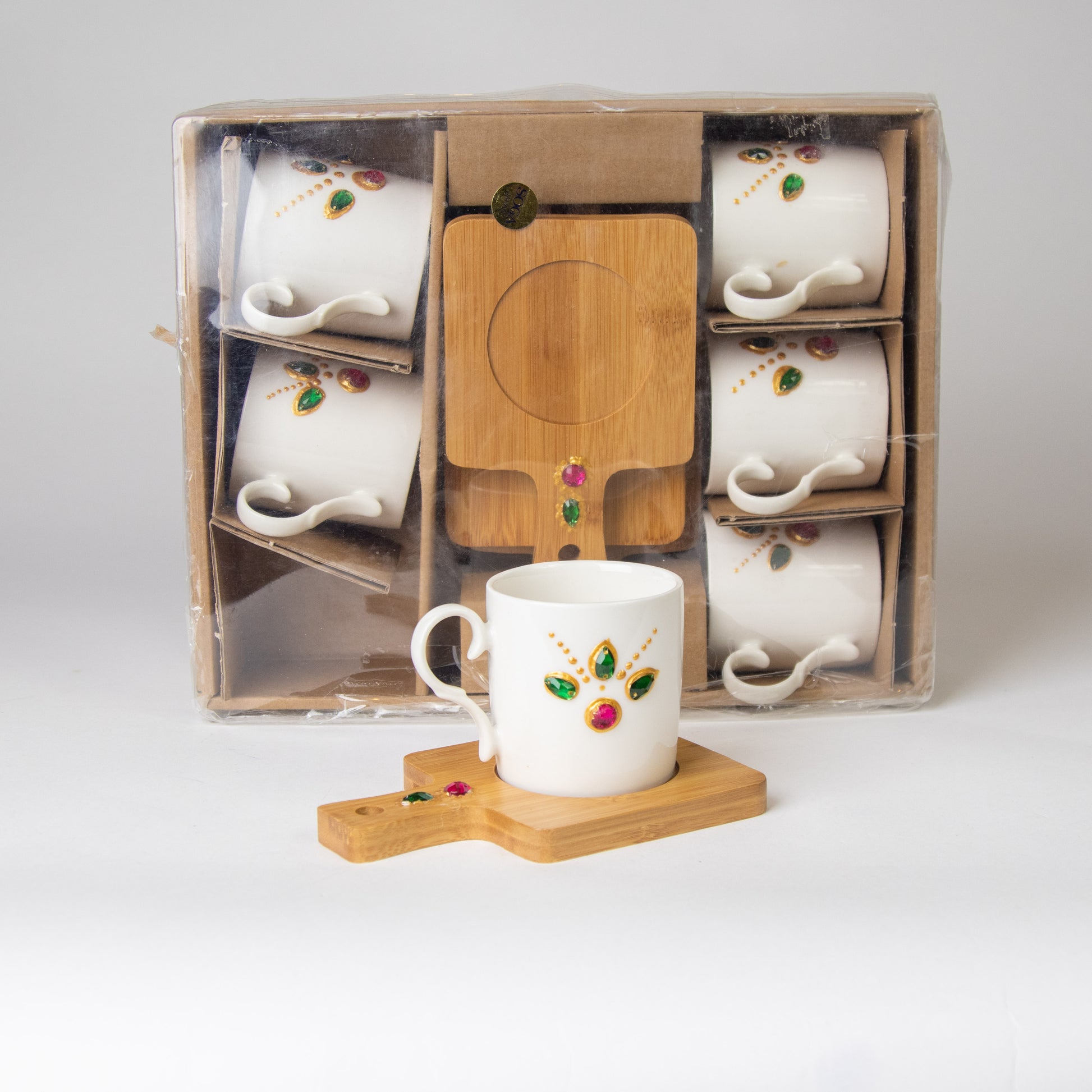 طقم مكون من ست أكواب مع صحون خشبية مرسومة يدويا