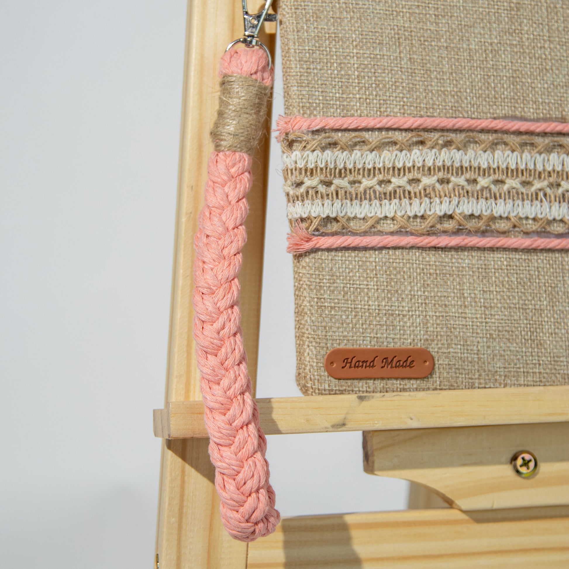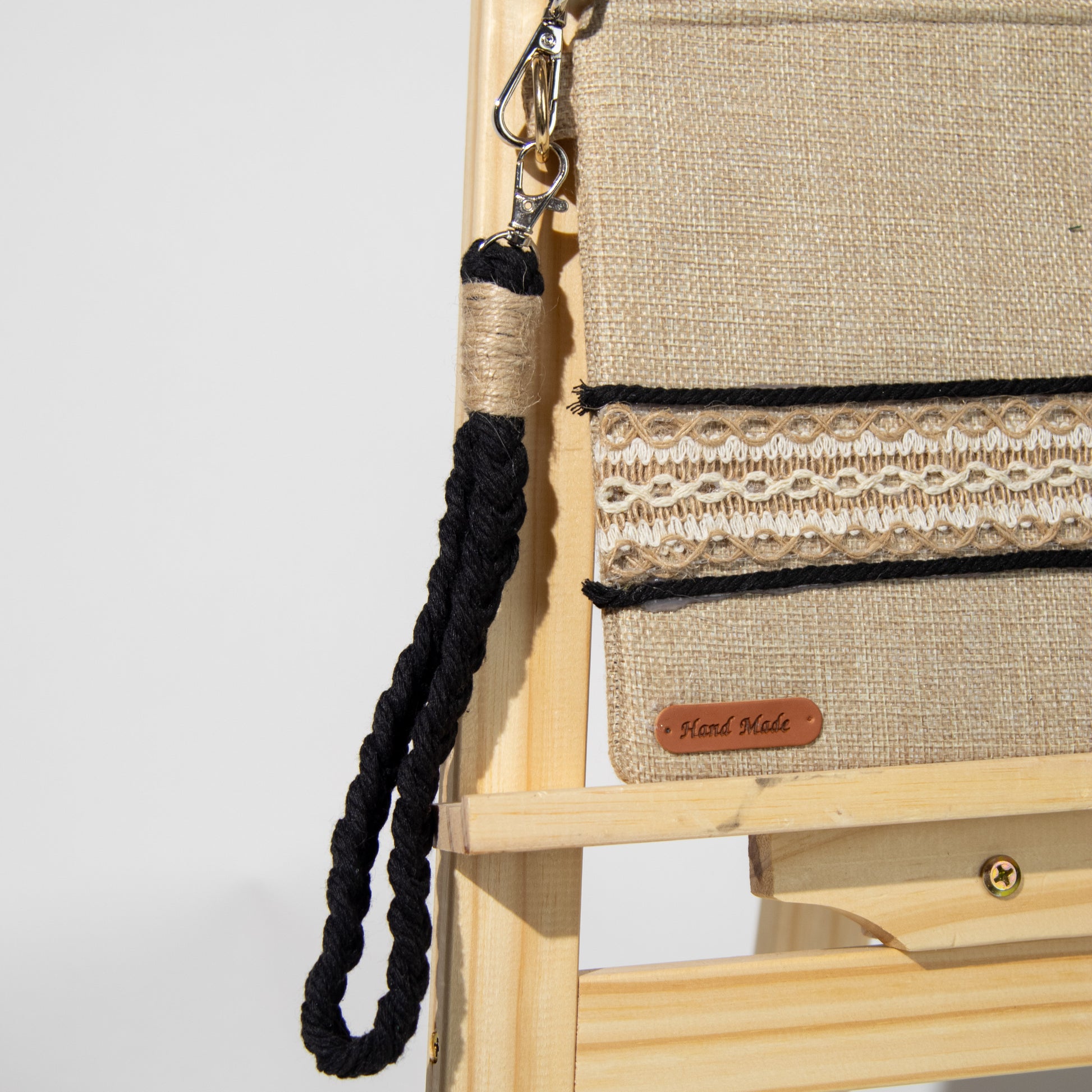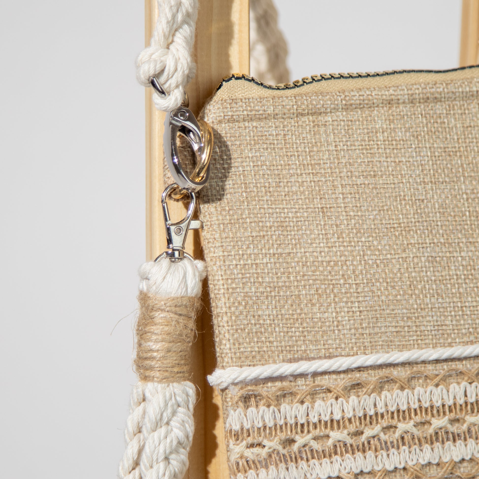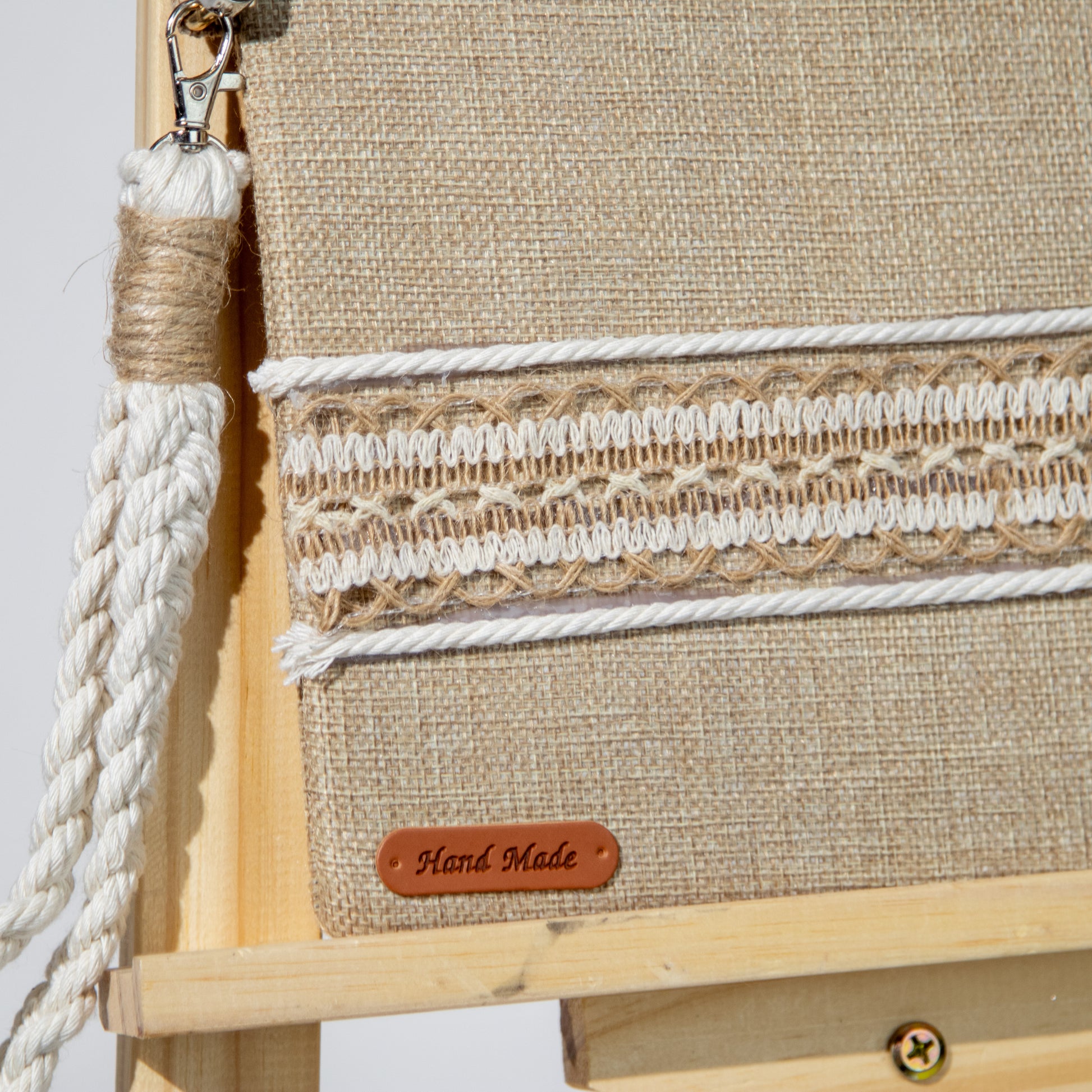 شنطة خيش ناعم مع ذراع مكرمية رفيع وميدالية مكرمية ومزينة بشريط خيش عريض