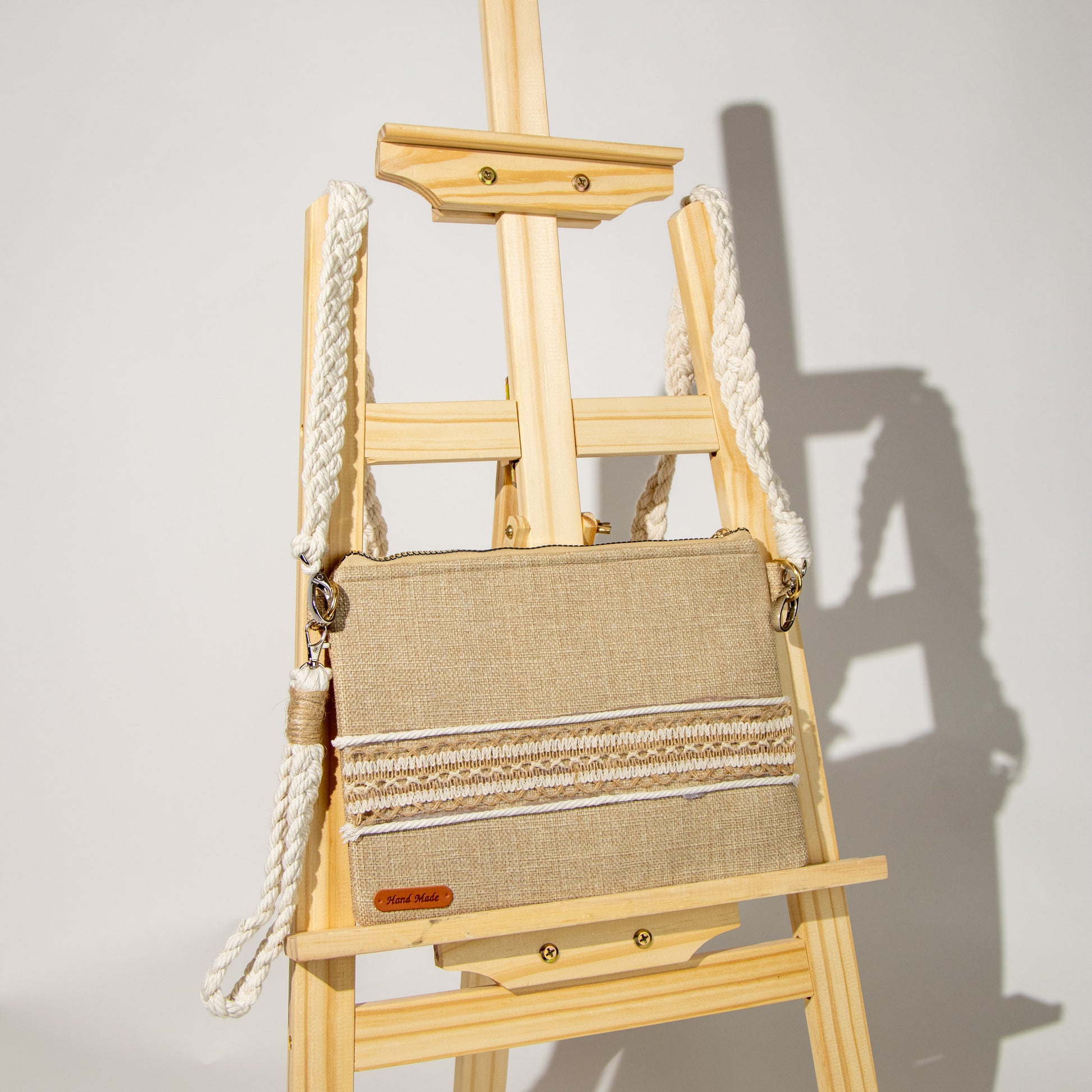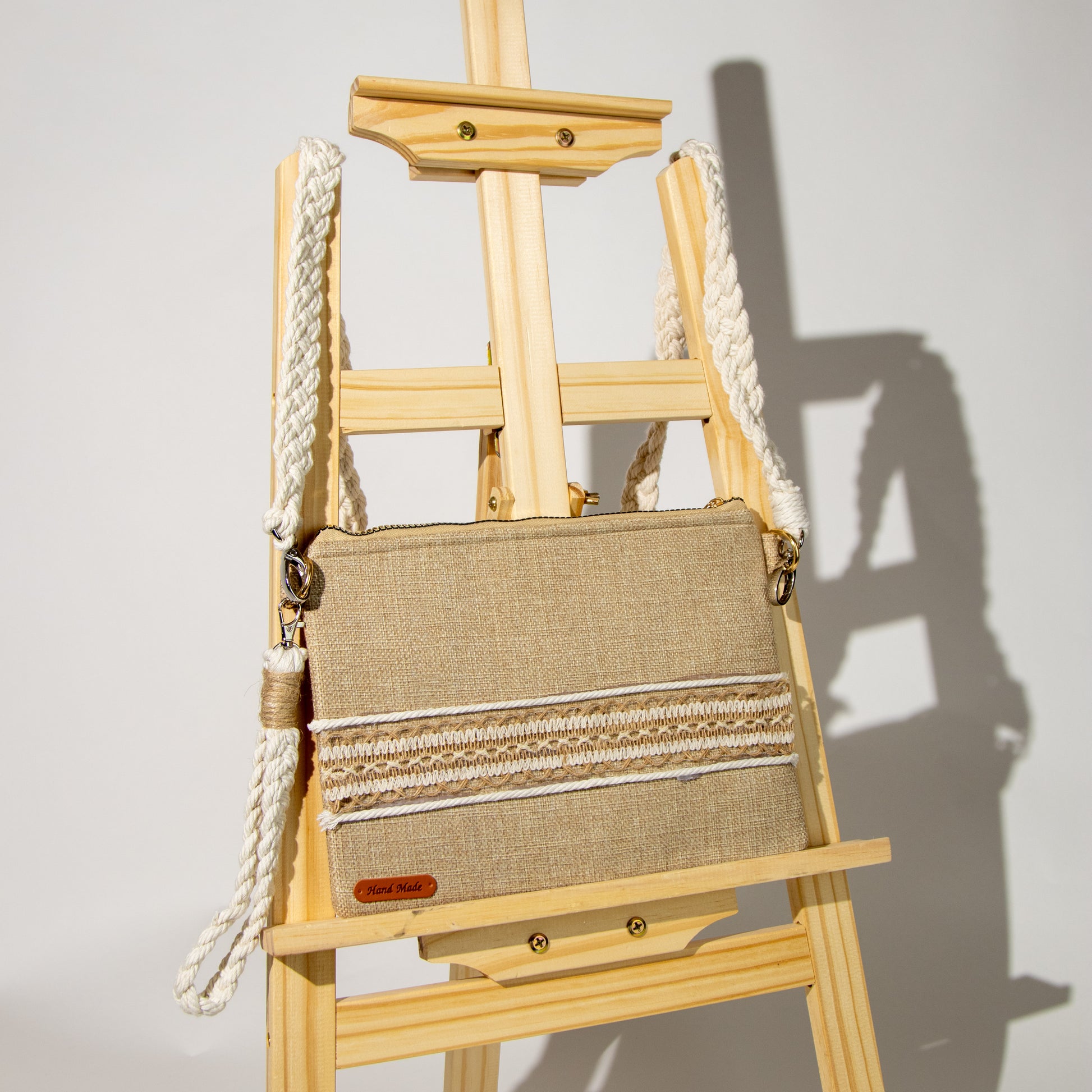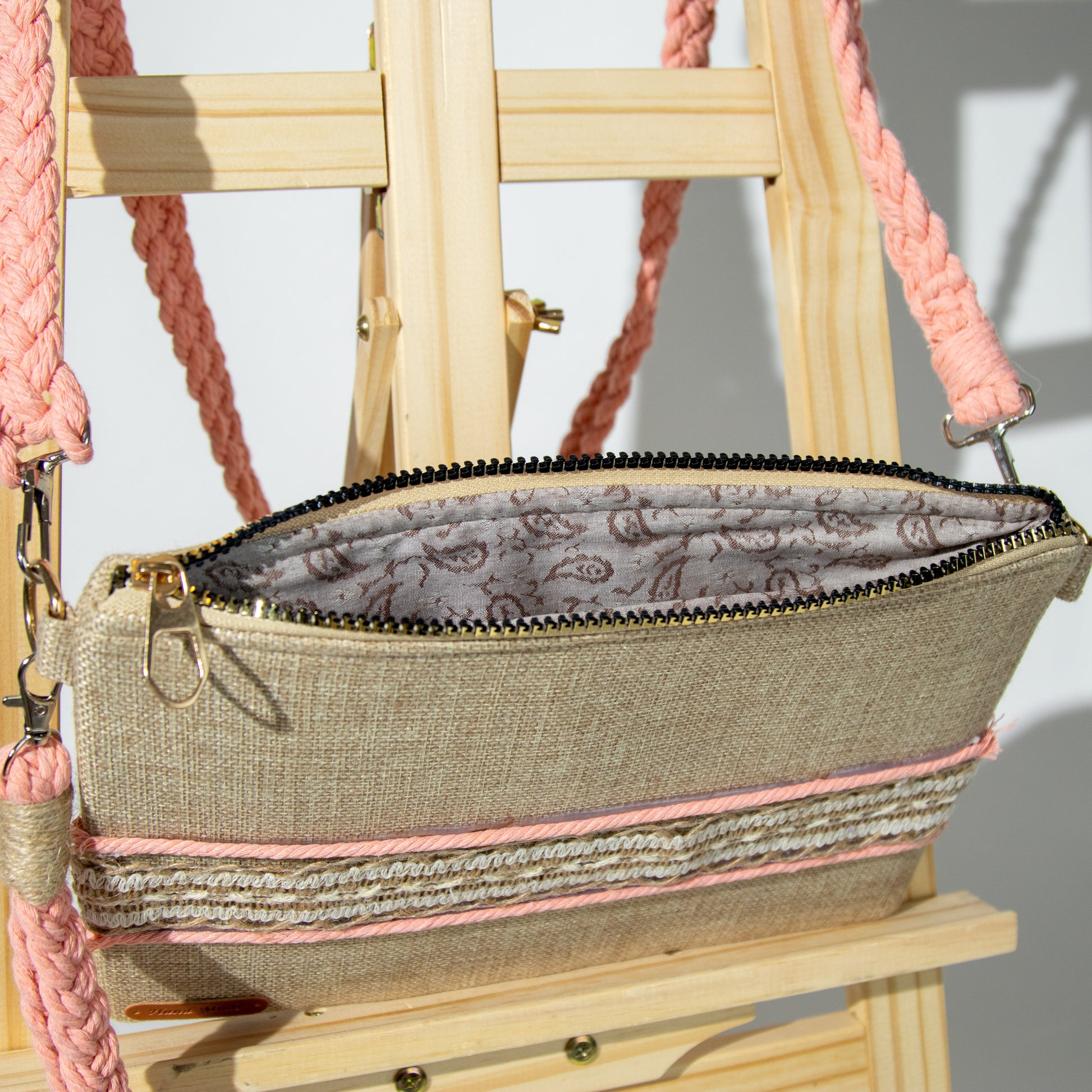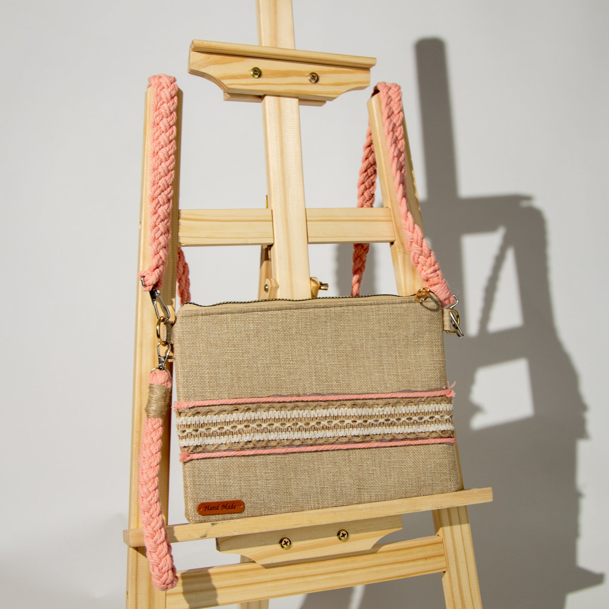 شنطة خيش ناعم مع ذراع مكرمية رفيع وميدالية مكرمية ومزينة بشريط خيش عريض