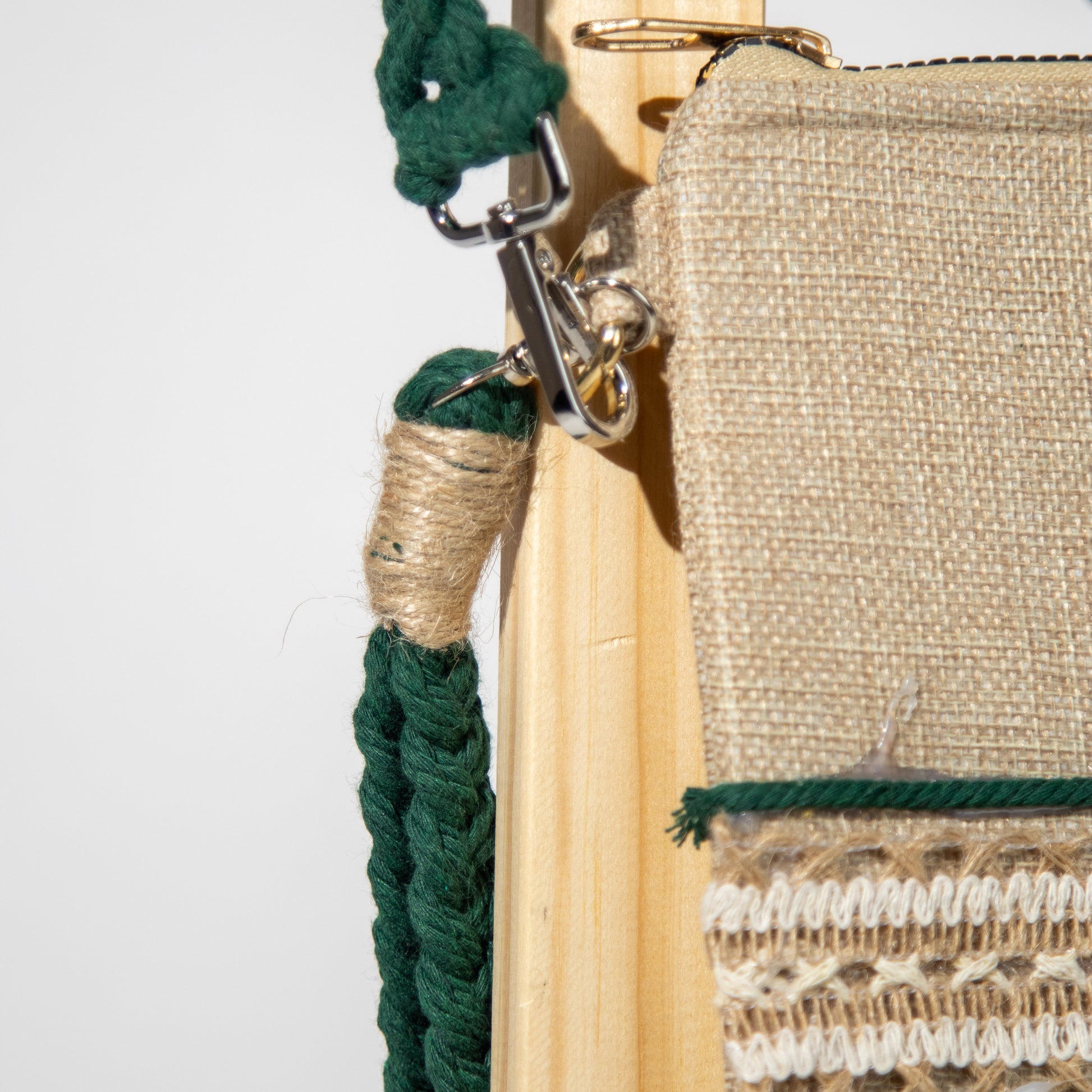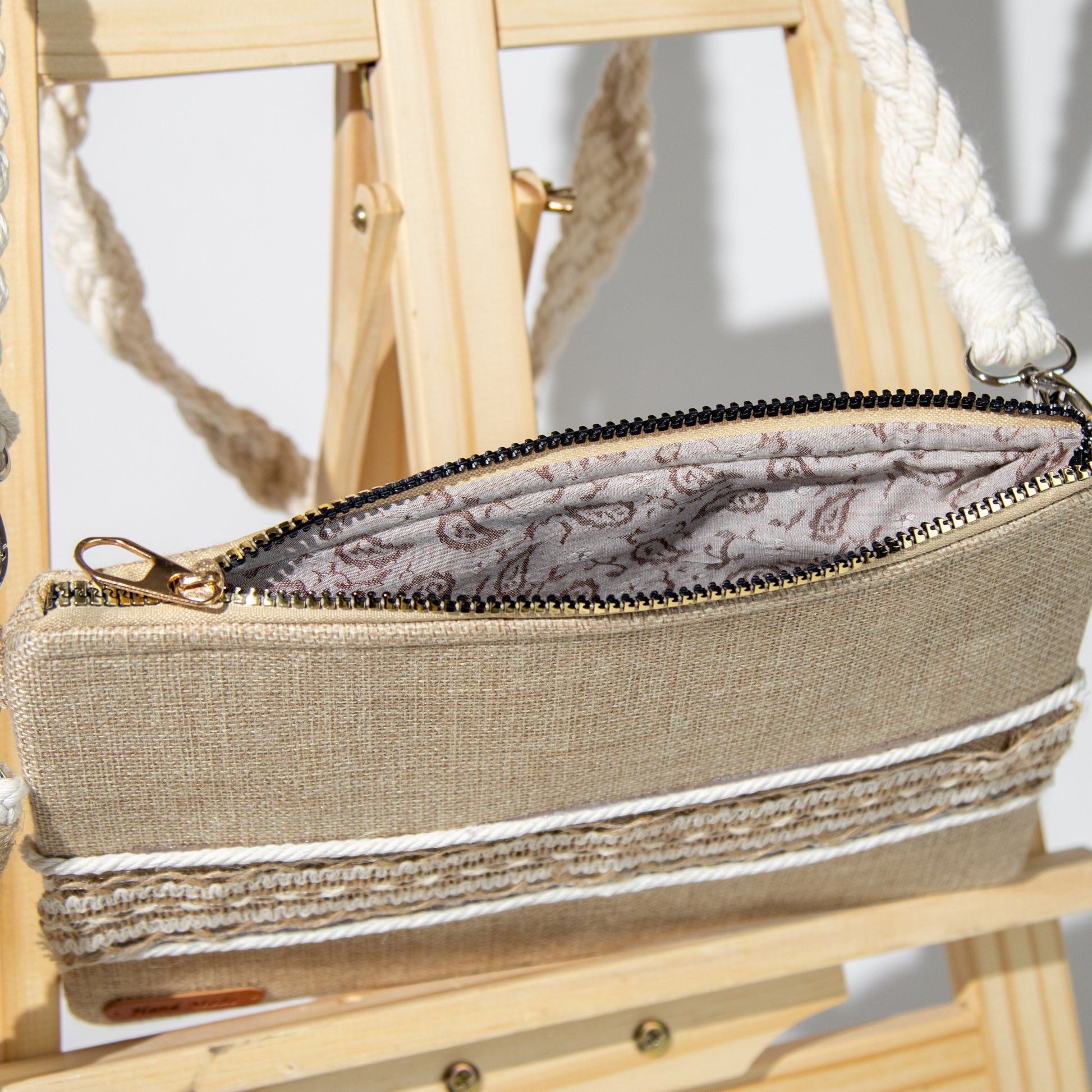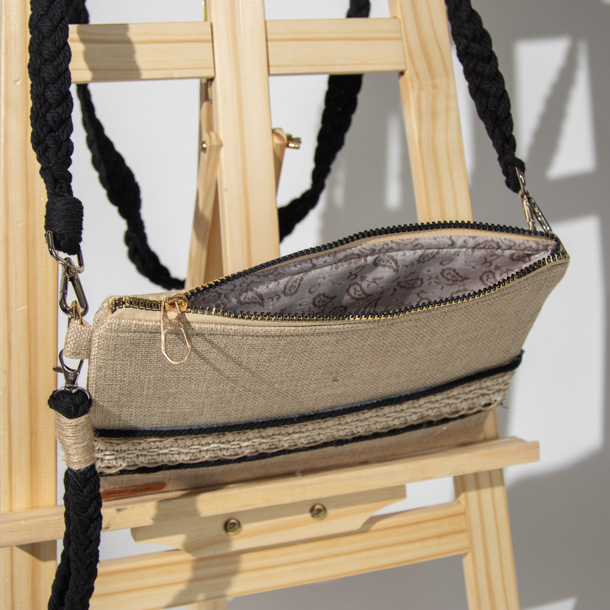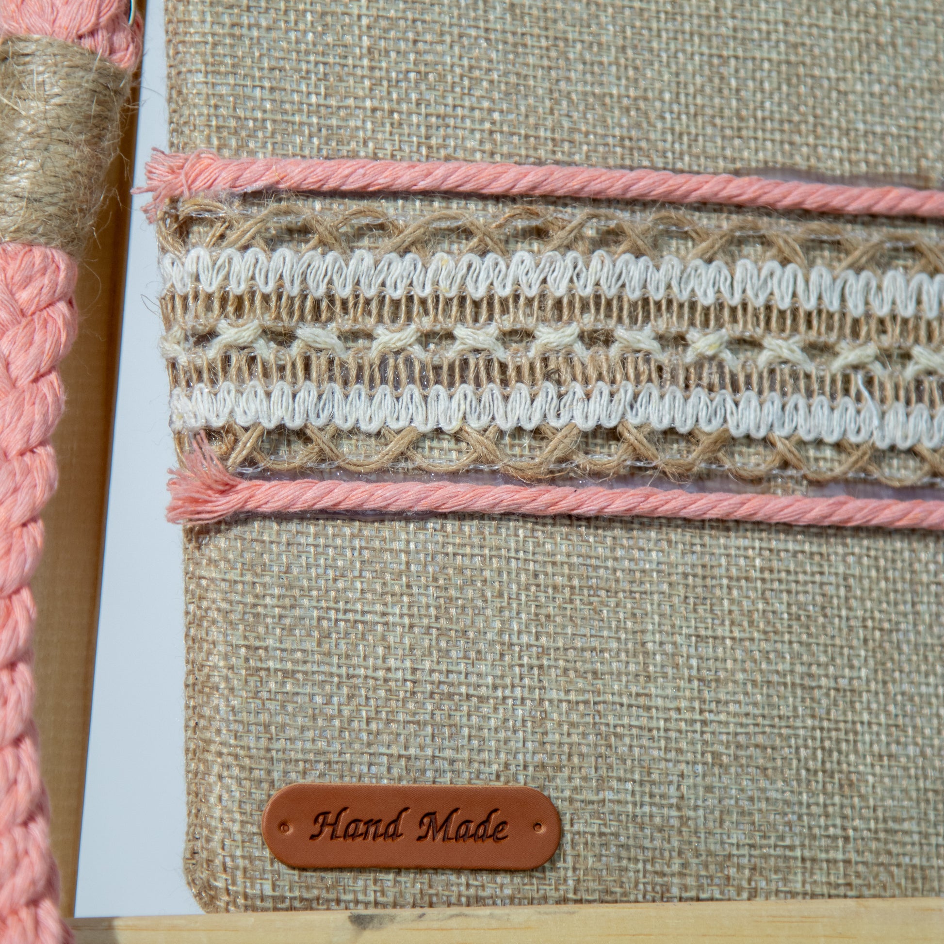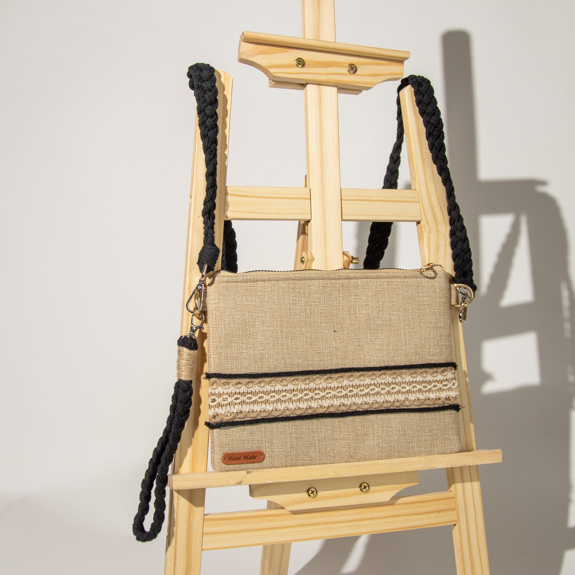 شنطة خيش ناعم مع ذراع مكرمية رفيع وميدالية مكرمية ومزينة بشريط خيش عريض