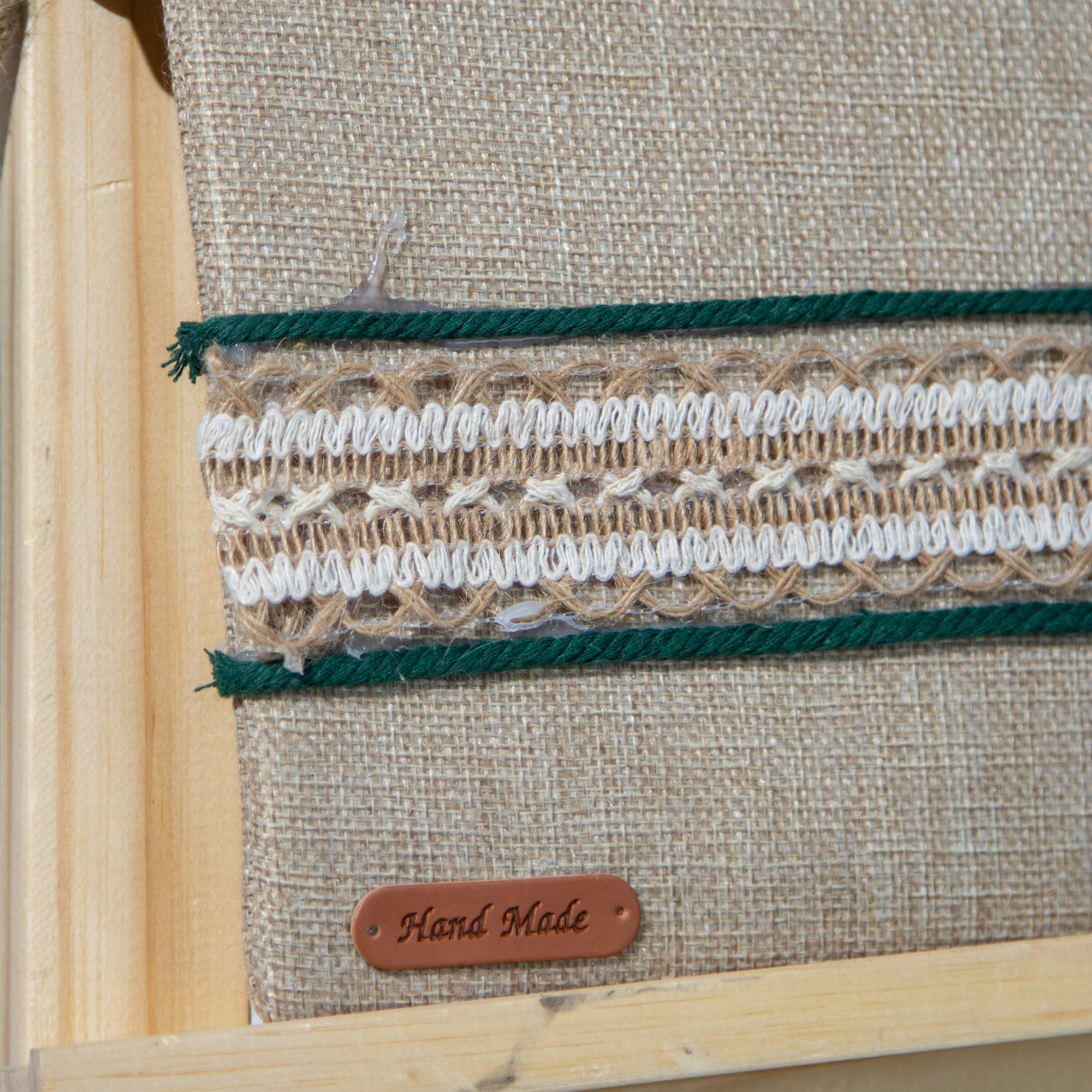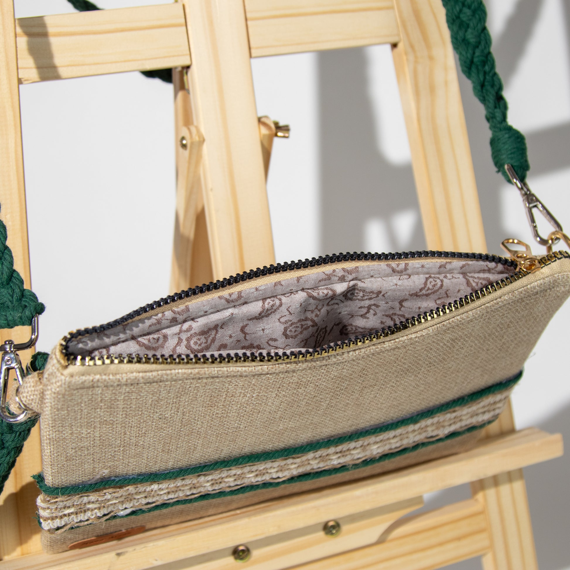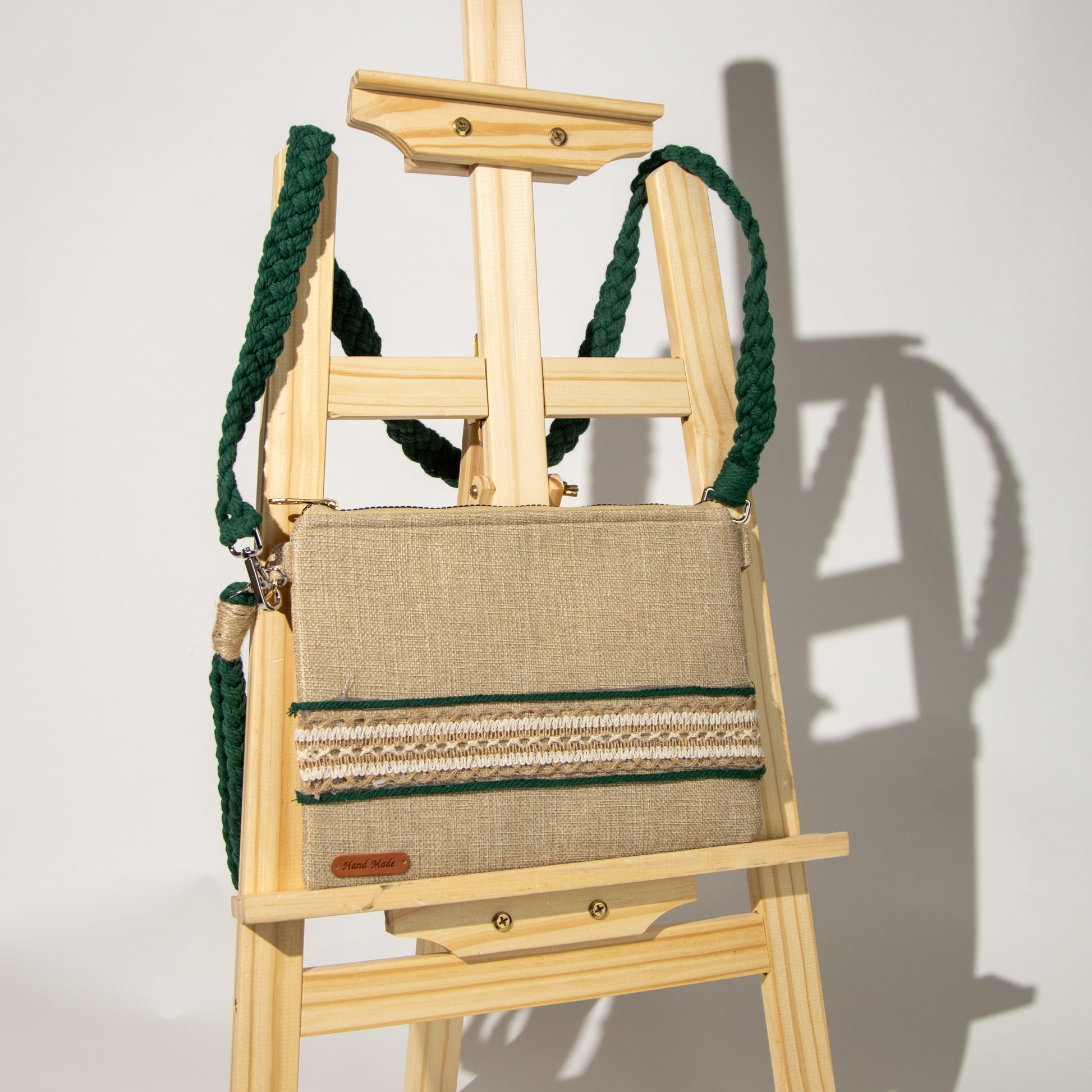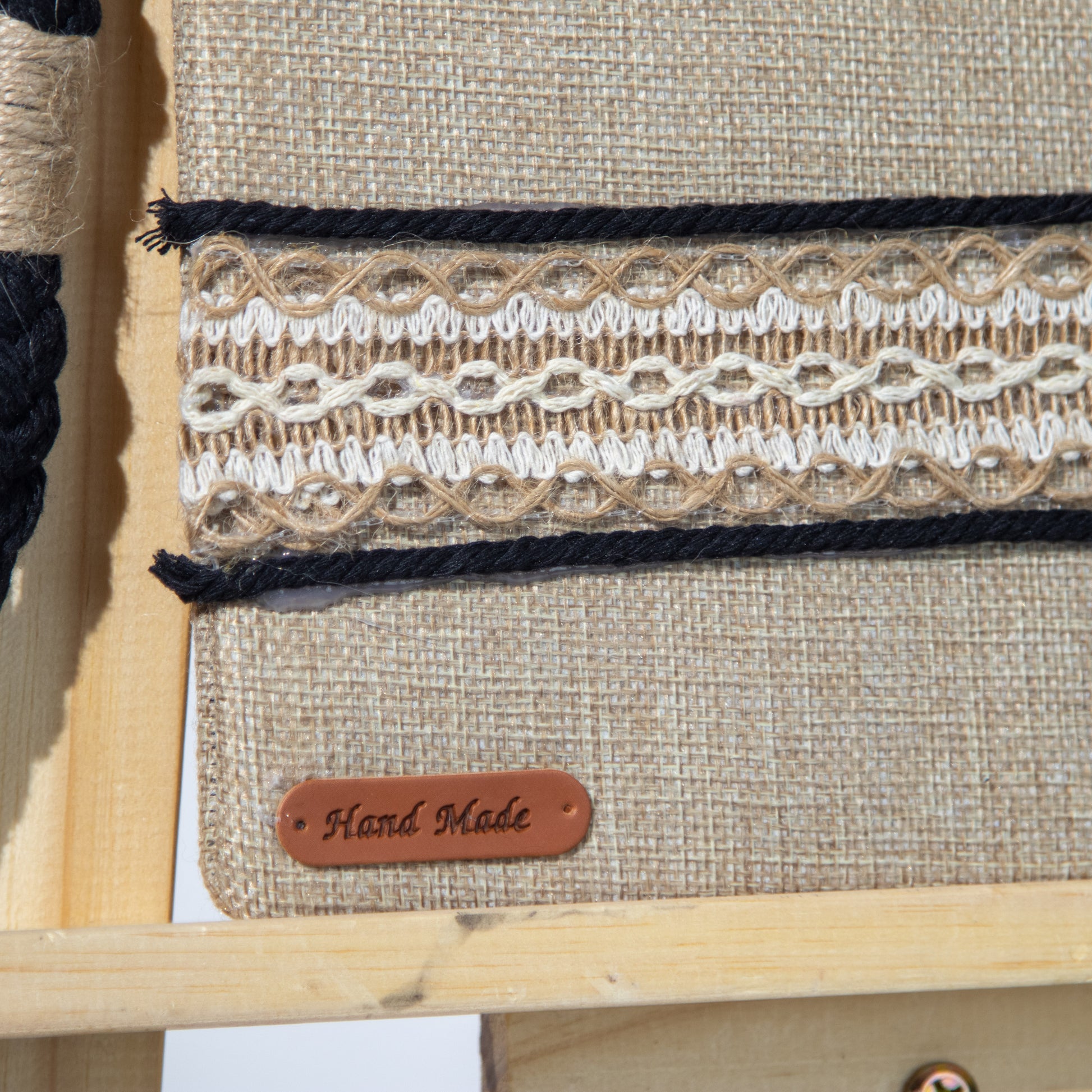 شنطة خيش ناعم مع ذراع مكرمية رفيع وميدالية مكرمية ومزينة بشريط خيش عريض