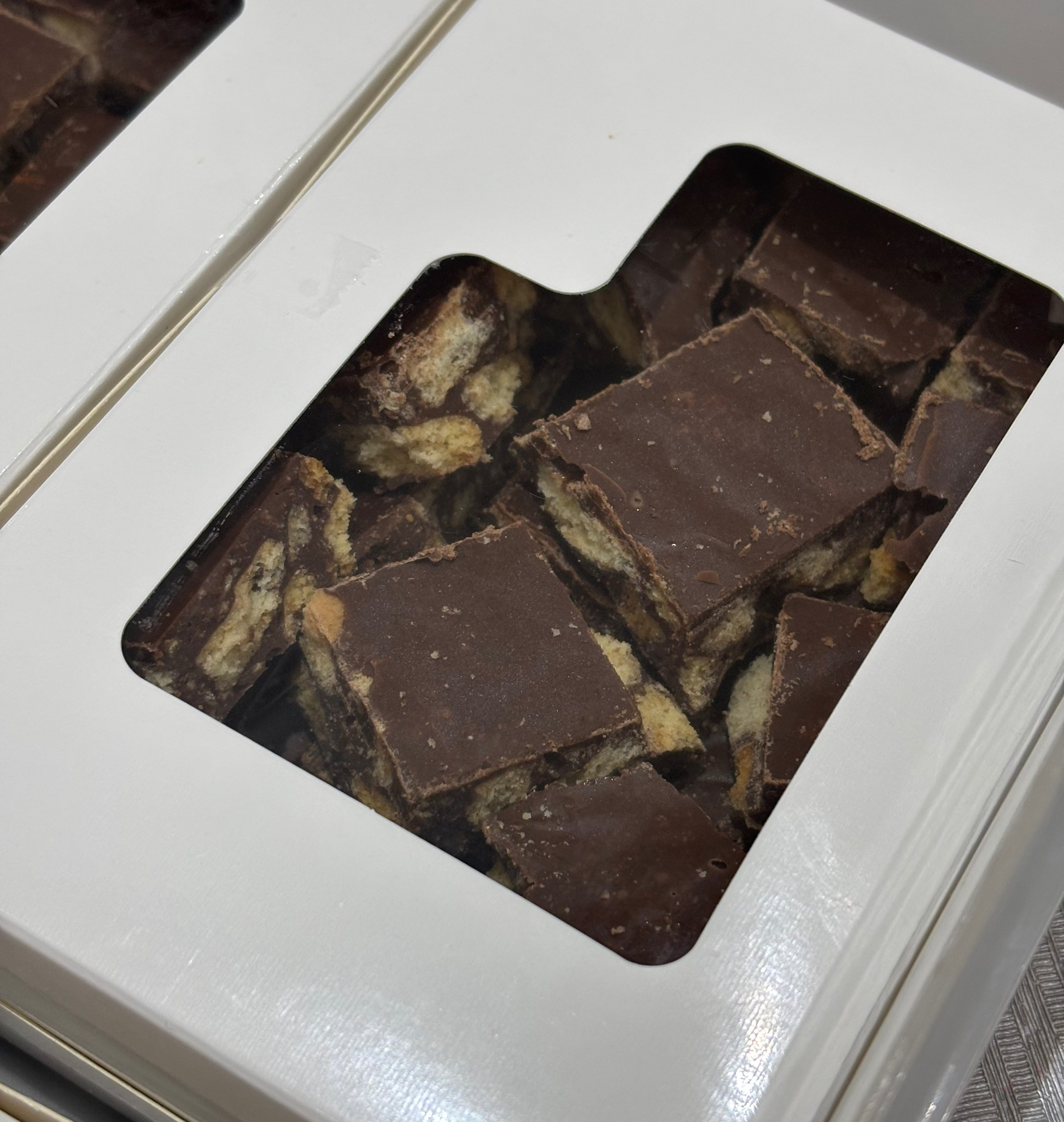 خليط 3 أنواع من الشوكولاتة الفاخرة، ممزوجة مع قطع البسكوت المقرمش.
