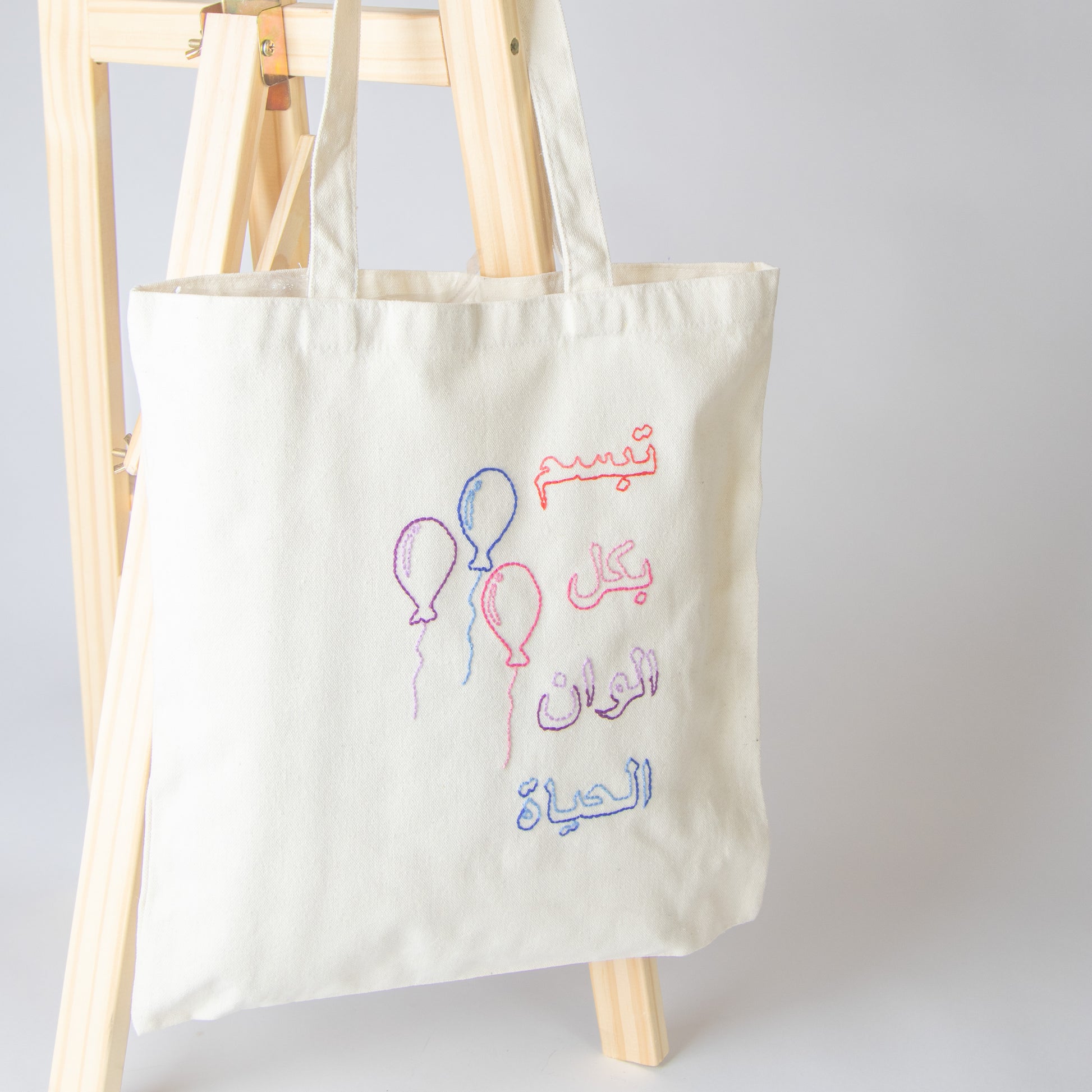 حقيبة مع عبارة تطريز تبسم بكل ألوان الحياة