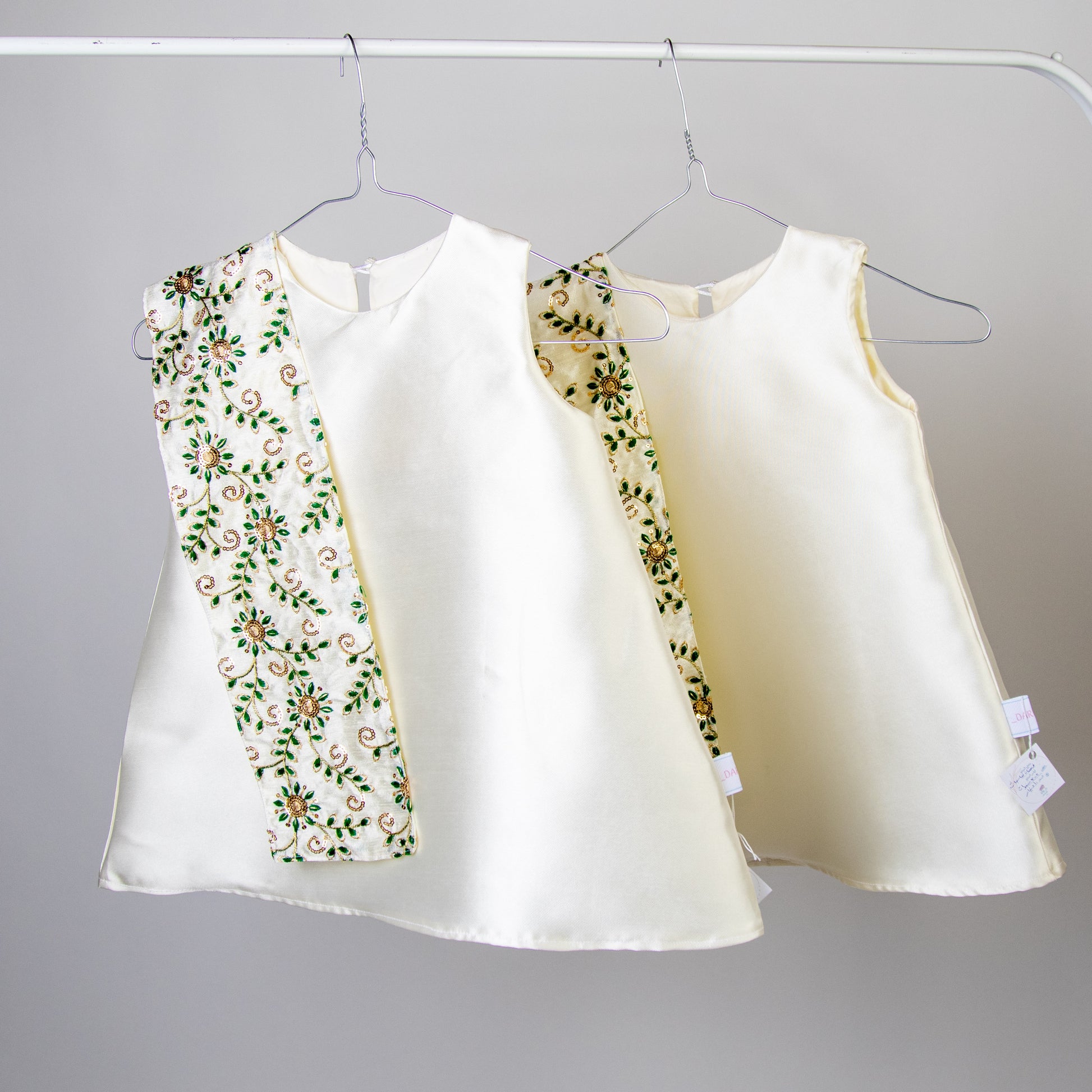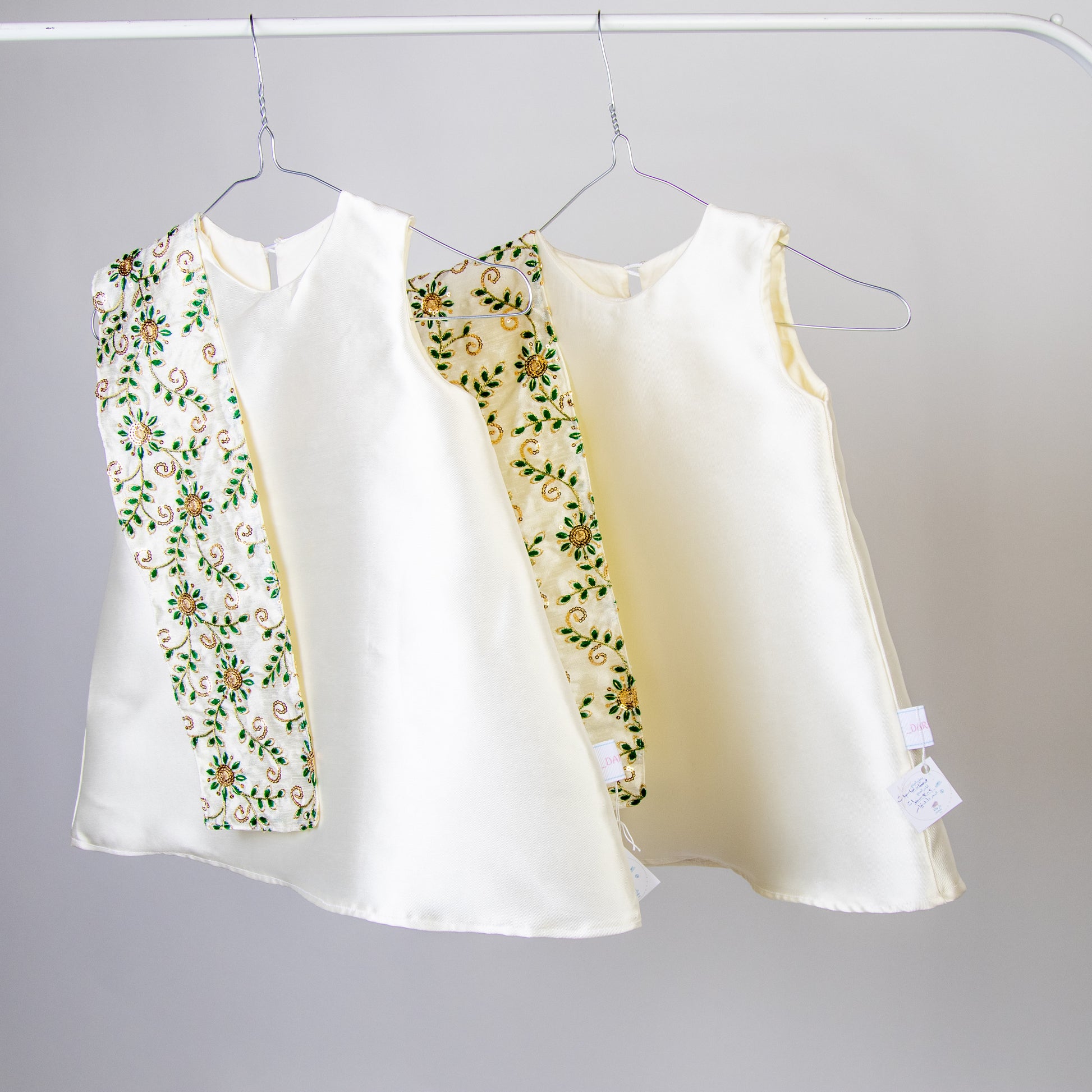 فستان راقي بلون اوف وايت مع شال مشجر أخضر وذهبي